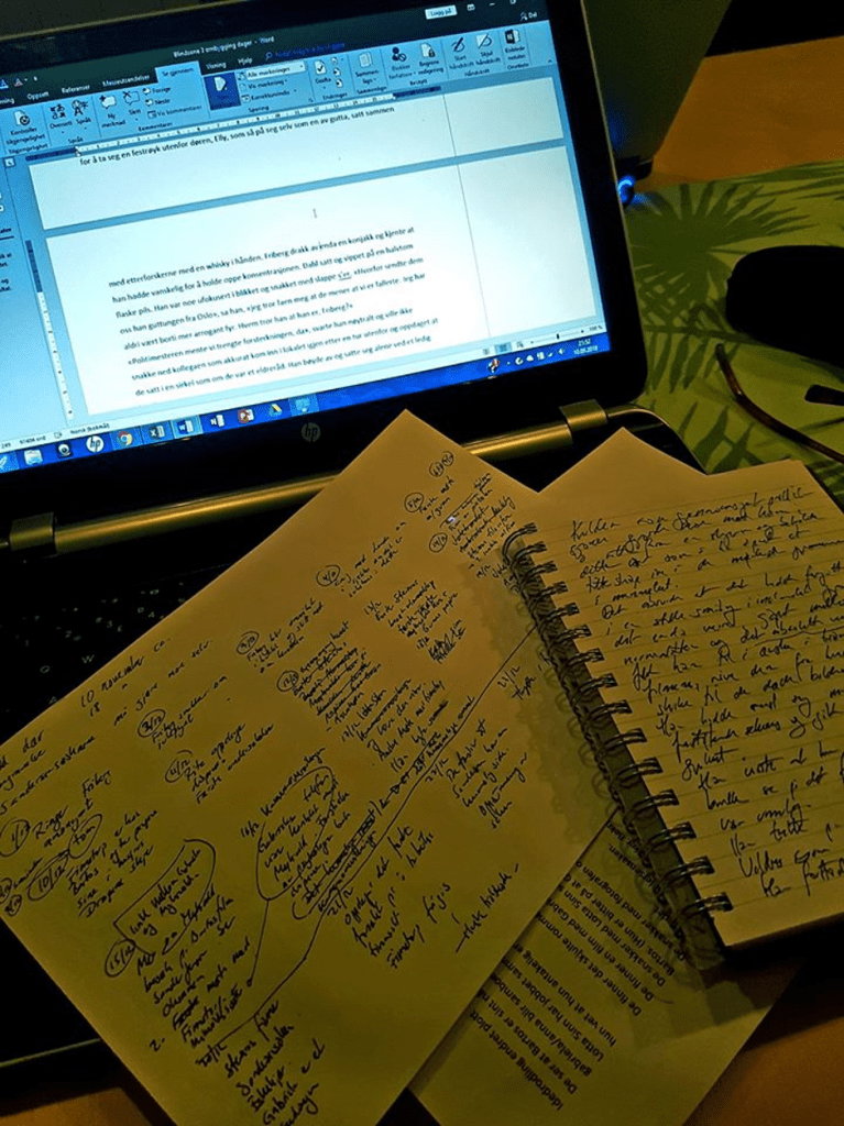 På forhånd aner jeg ikke hvilken stemning en slik tekst vil få, og jeg planlegger heller aldri å skrive i noen spesiell stil eller form, ikke siden jeg forkastet hardkokt-sjangeren med min første detektiv har jeg forsøkt å skrive innenfor en mal. Jeg skriver politikrim og det er vel kanskje på sett og vis en mal, men historien får utfolde seg, så får den ende opp i den stilen min fortellerstemme gir den. Den har forandret seg; jeg fikk tilbakemeldinger fra gjennomlesere som sa de hørte ‘min stemme’ i det jeg skrev og ikke en ‘nøytral’ fortellerstemme, dvs. jeg hang igjen i en skrivemåte som kanskje var mer pretensiøs enn hensiktsmessig. Denne stilen var kanskje preget av ting jeg var inspirert av tidlig i mitt skriveliv, (jeg har muligens på et tidspunkt forlest meg på Dan Turell) eller hardkokt-sjangerens skråblikk-betraktning av verden omkring. Tilbakemeldingen hjalp meg å rydde ut slike ting og gjøre historienes fortellerstemme mer ensartet og altså ‘nøytral’. Dette lyder muligens som tøys, men det handler om at man med denne fortellerstemmen skal entre problemfritt inn i leserens hode, og da er det en fordel for leseopplevelsen at den ikke skaper irritasjon.