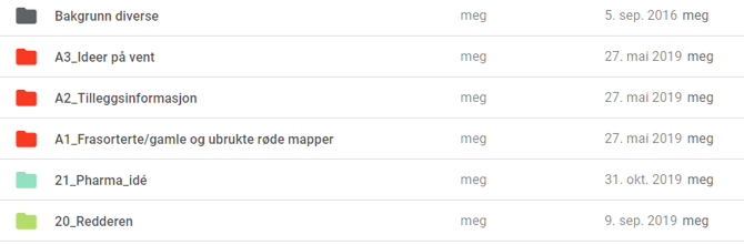 Dette er knagger å bygge videre på, kroker å hekte historien fast i. Jeg kan skrive slike scener og legge inn gåter for meg selv som antydninger og halvt forklarte setninger, ting som kan anspore til et troverdig og forhåpentligvis medrivende plott. Jeg kaller dette et anslag, et oppslag eller bare en løs idé. Jeg kan spare på disse i lange tider uten å finne noe hjem til dem, jeg samler disse enten i en fellesmappe i skyen eller i mine spiralryggede notatbøker. Om jeg har troen på at dette er noe å gå videre med, gir jeg den et mappenummer og et foreløpig navn for prosjektet.